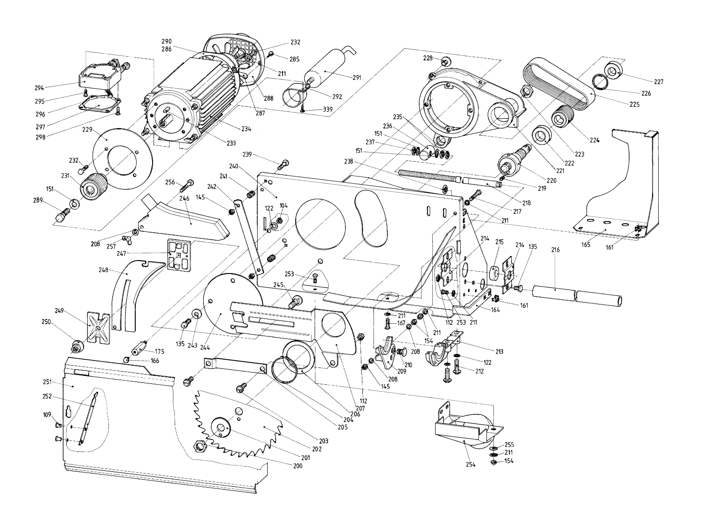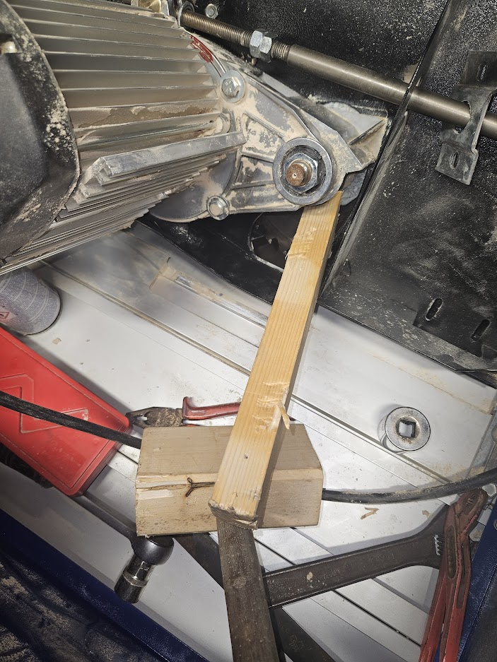 To be able to remove the pull bolt, the feed spindle “218” must be completely withdrawn from it. This may be easier to do if the saw is in the lowest possition. The height can be adjusted up by using a piece of wood wedged towards an edge on the chip case as seen in the photo. To adjust it down, use a wood mallet just on the other side of where the piece of wood is pushing.